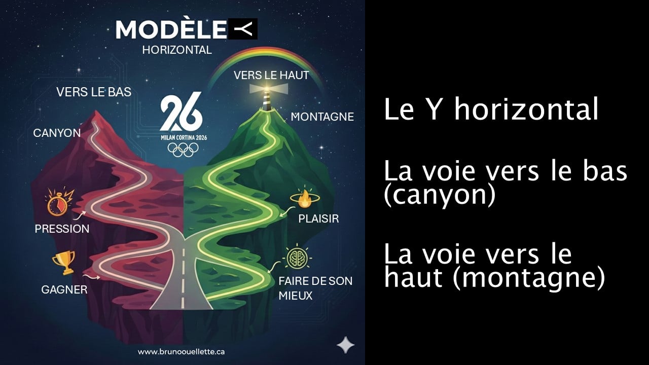Ce vendredi soir 6 février 2026, le monde aura les yeux rivés sur Milan. Le drapeau olympique va flotter et la vieille devise résonnera encore : Citius, Altius, Fortius. Plus Vite. Plus Haut. Plus Fort. C’est inspirant. C’est la promesse du dépassement de soi de Pierre de Coubertin. Mais pour un psychologue spécialiste de performance humaine, c’est aussi un signal d’alarme. Car derrière cette quête de l’extrême se cache un piège redoutable. Un piège dans lequel tombent autant les athlètes d’élite que les professionnels et entrepreneurs ambitieux. En écoutant ou lisant les entrevues des derniers jours (3 au 5 février), j'observe deux types de discours chez nos athlètes québécois. Ces mots ne sont pas anodins : ils nous révèlent s'ils s'élèvent vers la Montagne de la maîtrise ou s'ils s'approchent du Canyon de l'anxiété. C'est un modèle que j'ai intitulé le Y horizontal. Il y a la voie vers le bas et la voie vers le haut.